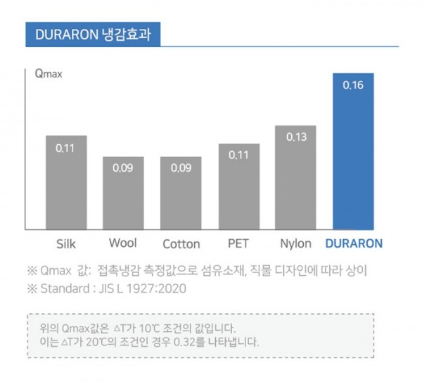 접촉 냉감이란 직물을 만지는 순간 시원하다고 느끼는 특성으로 피부와 직물 사이에 열적 대류 현상이 발생하여 생겨난다. 접촉 냉감성은 Qmax 값으로 측정하며 △T=10℃를 기준으로 하였을 때, Qmax 값이 0.1 이상이면 냉감성이 있다고 하는데, 듀라론 쿨은 0.16로 유사 제품 대비 가장 높은 냉감성을 나타냈다.