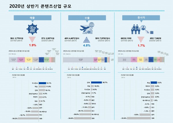 2020년 상반기 국내 콘텐츠산업 매출액은 전년 동기 대비 -1.9% 감소한 57조 3천억 원으로 집계됐다. ▲지식정보(12.1%) ▲게임(11.9%) ▲만화(10.1%) 등 비대면 소비가 가능한 장르들은 높은 성장률을 기록했으며, ▲영화(-54.2%) ▲광고(-18.7%) ▲애니(-10.4%) ▲음악(-9.0%) 등 대면 소비 비중이 크거나 경기변동과 직결된 장르들은 큰 폭으로 감소했다.