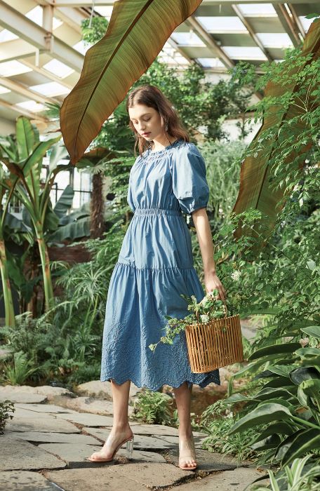 특히 화보 속 모델이 착용한 스카이 블루 컬러 원피스는 네크라인과 허리라인 등에 셔링으로 포인트를 줘 우아하고 여성스러운 실루엣이 돋보인다. 밑단에는 꽃을 형상화한 자수 펀칭 디테일이 가미되어 리조트룩 스타일로도 제격이다. 뿐만 아니라 클래식한 무드의 화이트 셋업 수트는 자연스러운 핏과 절제된 디자인으로 오피스룩은 물론 각종 모임에서 활용하기 좋다.